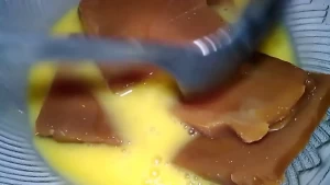 - Masukkan irisan Kue Keranjang kedalam telur,